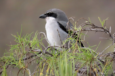 Gavilán común, macho, posado entre los arbustos, dedicado a limpieza de plumas y dar pequeñas sacudidas.